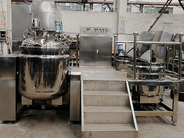 物料在水锅、油锅内通过加热、搅拌进行混合反应后,由真空泵吸入乳化锅,通过乳化锅内上部的中心搅拌、聚四氟乙烯刮板始终迎合搅拌锅形体,扫净挂壁粘料,使被刮取的物料不断产生新界面,再经过叶片的剪断、压缩、折叠,使其搅拌、混合而向下流往锅体下方的均质器处,物料再通过高速旋转的切割轮与固定的切割套之间所产生的强力的剪断、冲击、乱流等过程,物料在剪切缝中被切割,迅速破碎成200um-0.2um的微粒,由于乳化锅内处于真空状态,物料在搅拌过程中产生的气泡被及时抽走。采用抽真空的方式,使所生产的制品在搅拌过程中不再混入气泡,从而保证可制造出富有光泽、细腻及延展性良好的产品。