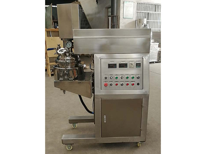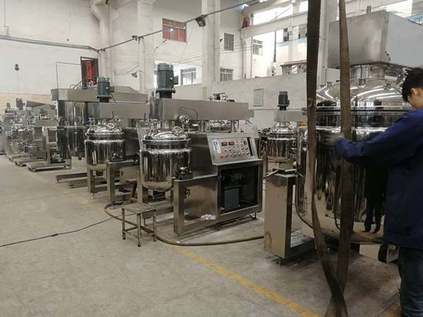 物料在水锅、油锅内通过加热、搅拌进行混合反应后,由真空泵吸入乳化锅,通过乳化锅内上部的中心搅拌、聚四氟乙烯刮板始终迎合搅拌锅形体,扫净挂壁粘料,使被刮取的物料不断产生新界面,再经过叶片的剪断、压缩、折叠,使其搅拌、混合而向下流往锅体下方的均质器处,物料再通过高速旋转的切割轮与固定的切割套之间所产生的强力的剪断、冲击、乱流等过程,物料在剪切缝中被切割,迅速破碎成200um-0.2um的微粒,由于乳化锅内处于真空状态,物料在搅拌过程中产生的气泡被及时抽走。采用抽真空的方式,使所生产的制品在搅拌过程中不再混入气泡,从而保证可制造出富有光泽、细腻及延展性良好的产品。