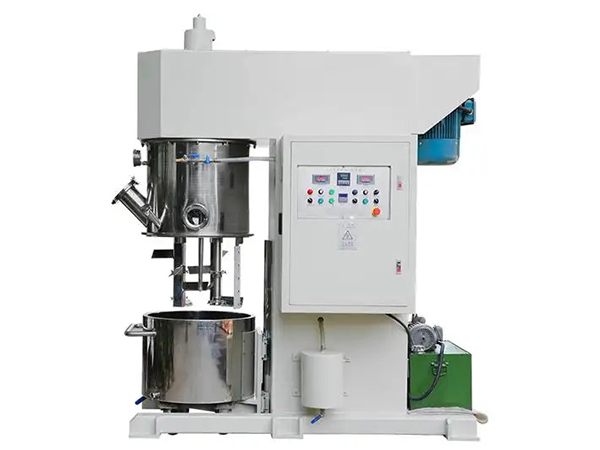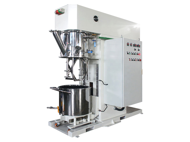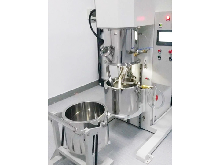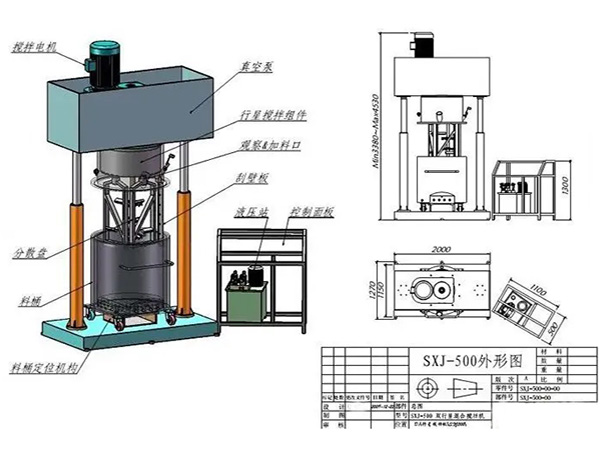 双行星混合搅拌机是一种对多种液体、粉体进行混合搅拌、溶解、分散、均质的搅拌设备,分为减速电机、封盖、行星架,高速、低速、活动刮板三轴,刮壁器、料桶、双柱液压升降系统、真空系统以及机架等构成。双行星混合搅拌机能在真空下工作,可不断的排出水分和其他的挥发物,因此,可作为脱气釜使用。料桶可根据需要采用油、水循环加热或冷却;也可使用蒸汽加热。加热温度通过控制面板上的温度控制仪显示。行星分散混合机(行星搅拌机)应用于高粘度电池、涂料、有机硅胶、油墨、染料、粘胶剂等。