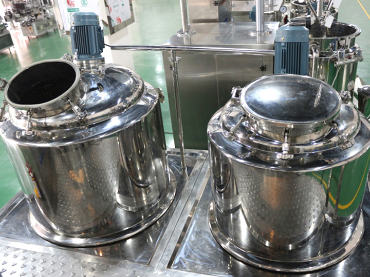 真空乳化机主要由水相锅、油相锅、乳化搅拌主锅、真空系统、升降系统(可选)、电器控制系统(可选用PLC)、操作平台等组成。