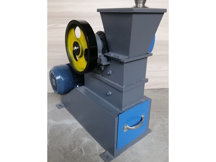 电机通过皮带轮驱动偏心轴旋转,动颚随之做往复运动。